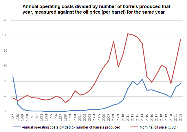 Norwegian oil and gas fields generally have high development costs but low operating costs compared to other countries.[REMOVE]Fotnote: Statoil. (1990, november). Gullfaks – glimt fra historien om et helnorsk oljefelt. Den norske stats oljeselskap a.s. Stavanger. Side 12. https://www.nb.no/items/4f4ceb82f9be24c64834e1a04a0a7ca1?page=0&searchText=helnorsk Gullfaks was no exception. In the early years after startup, the cost to produce one average barrel of oil from Gullfaks was less than one U.S. dollar. Once the platform was built and operational, it would have taken a major collapse for annual production to run at a loss.[REMOVE]Fotnote: The figures are sourced from the Norwegian Offshore Directorate’s fact pages and converted to U.S. dollars based on the average exchange rate for the respective year.