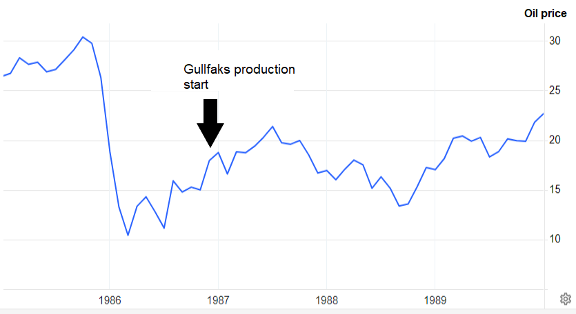 The graph below shows the oil price per barrel in nominal dollars from 1984 to 1989. As the graph illustrates, the situation had improved somewhat by the time Gullfaks came online compared to the lowest point in the summer of 1986 — but it would take many years before prices returned to pre-collapse levels.