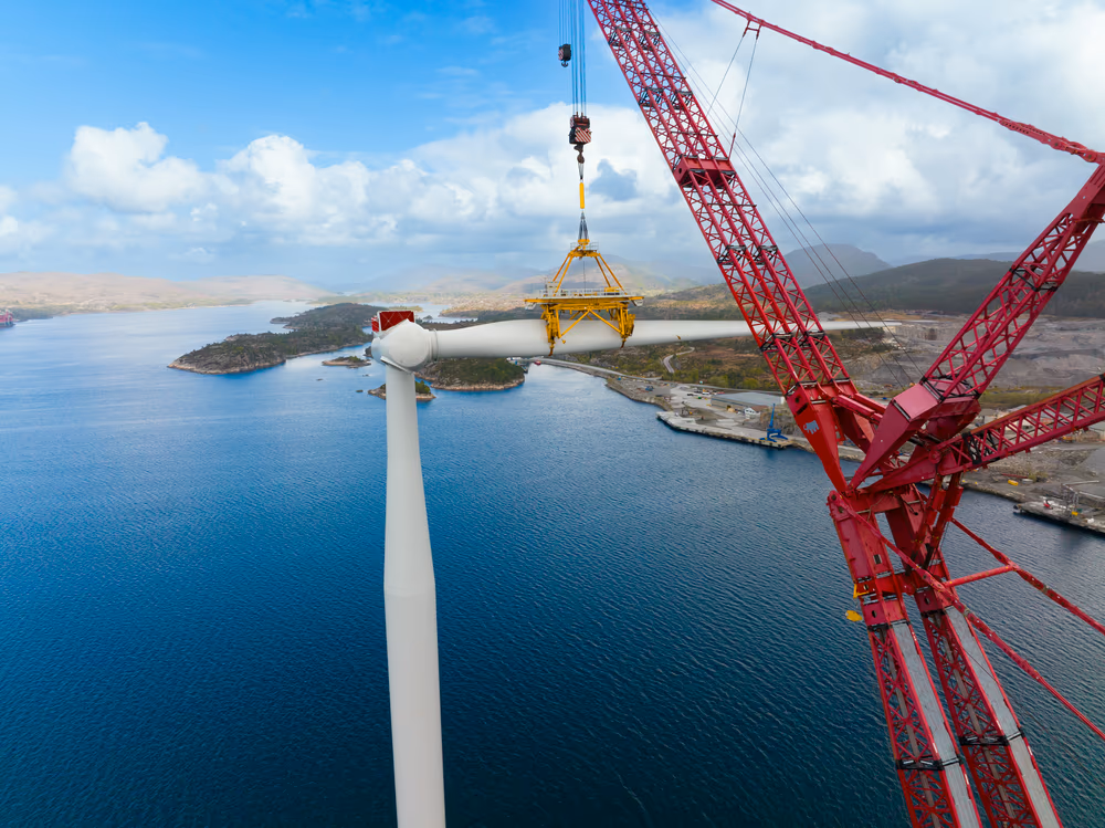 Next, the towers were installed. Each tower was assembled from four segments stacked on top of each other. Then, the nacelle—which holds the rotor hub—and the three rotor blades were lifted into place using a land-based crane.