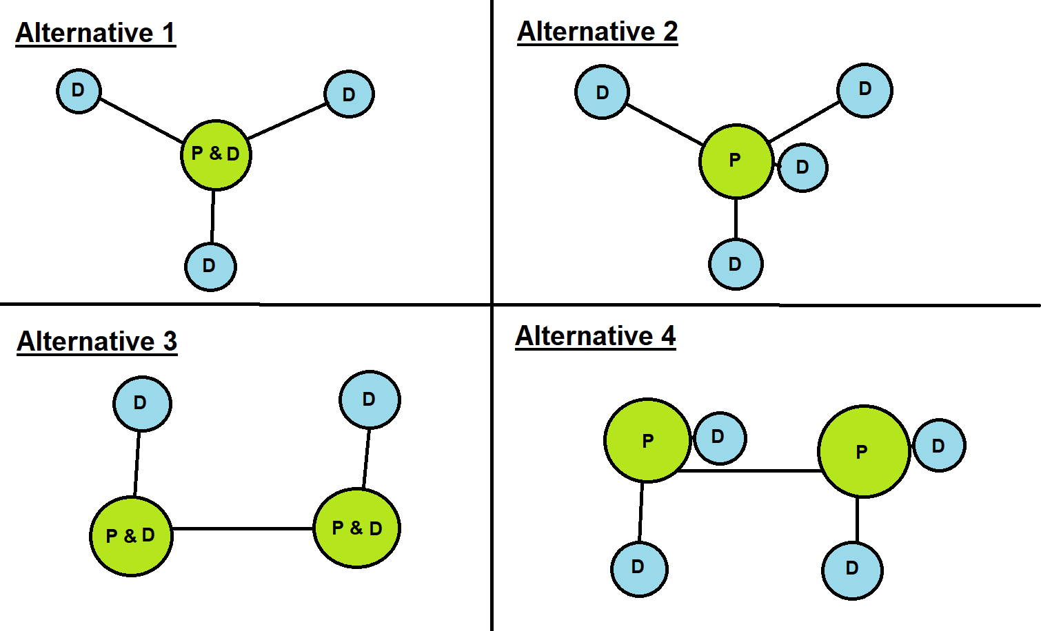 The figure below visualizes these four alternatives, showing only the types of platforms and their connections—not their exact locations.