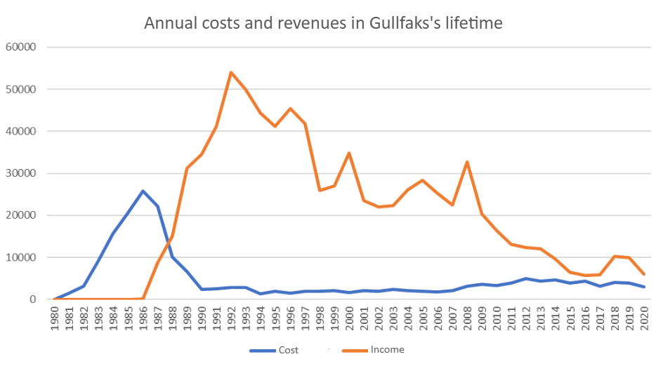 In addition to overall profitability, it is worth considering the payback period — how long it took before the field became profitable. Initially, Gullfaks had negative cash flow due to development costs. Investors also require a return on their capital.