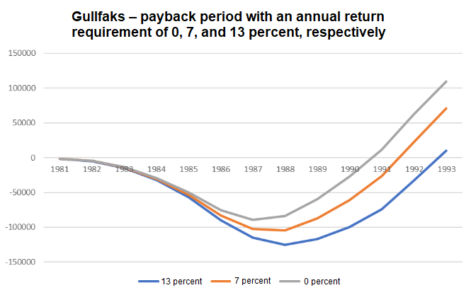The chart below illustrates how long it took before Gullfaks reached break-even, depending on the assumed rate of return (13, 7, and 0 percent).