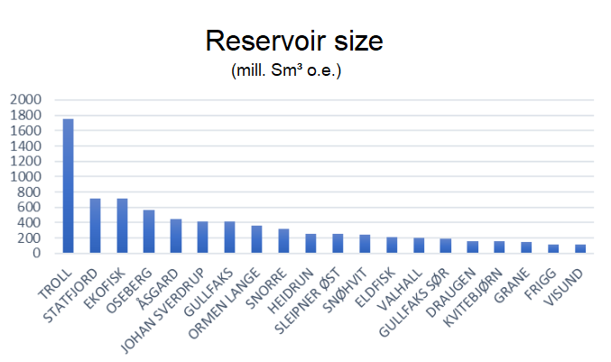 By Norwegian standards, Gullfaks is a large oil field.[REMOVE]Fotnote: The Norwegian Offshore Directorate estimated in 2024 that the original recoverable resources amount to 418.9 million standard cubic meters of oil equivalent, of which the vast majority (390.8) is oil.In terms of oil reserves alone, it is the fifth-largest in the country, and seventh-largest when including gas and NGL. The diagram below shows the 20 largest fields in Norway, with Gullfaks in seventh place.