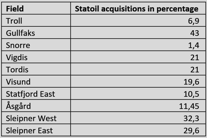 Statoil had argued that operations in the Tampen area would become more efficient if field operators (or other license holders) held larger ownership stakes. This is reflected in the fields where Statoil prioritized increasing its share. Six of the ten fields where Statoil made its largest acquisitions—Gullfaks, Snorre, Vigdis, Tordis, Visund, and Statfjord East—were in the Tampen area.