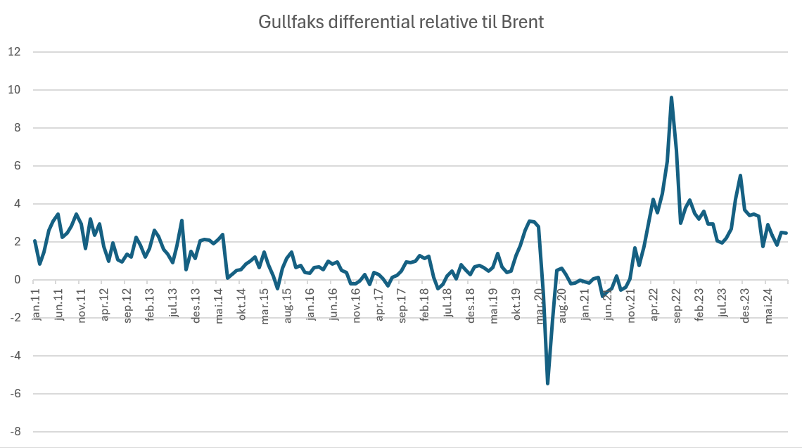 In 2022, when Russia launched its full-scale invasion of Ukraine and Europe responded with sanctions on Russian oil, the Gullfaks differential began climbing again — and has remained elevated since. The near-total disappearance of Russian crude from the European market had a strong effect on oil prices in general, but it also gave Gullfaks a significant boost in relative value.[REMOVE]Fotnote: Norwegian Ministry of Energy. (2024, December 9). Petroleum Price Board and Reference Prices. https://www.regjeringen.no/no/tema/energi/olje-og-gass/petroleumsprisradet–og-fastsetting-av-n/id661459/