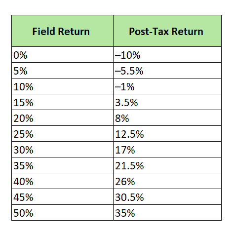 The table below shows post-tax returns for fields with different profit margins. “Field return” is the pre-tax return on investment. For example, if a field costs NOK 100 million and yields NOK 150 million in revenue, the return is 50%. If revenue equals cost, the return is 0%.