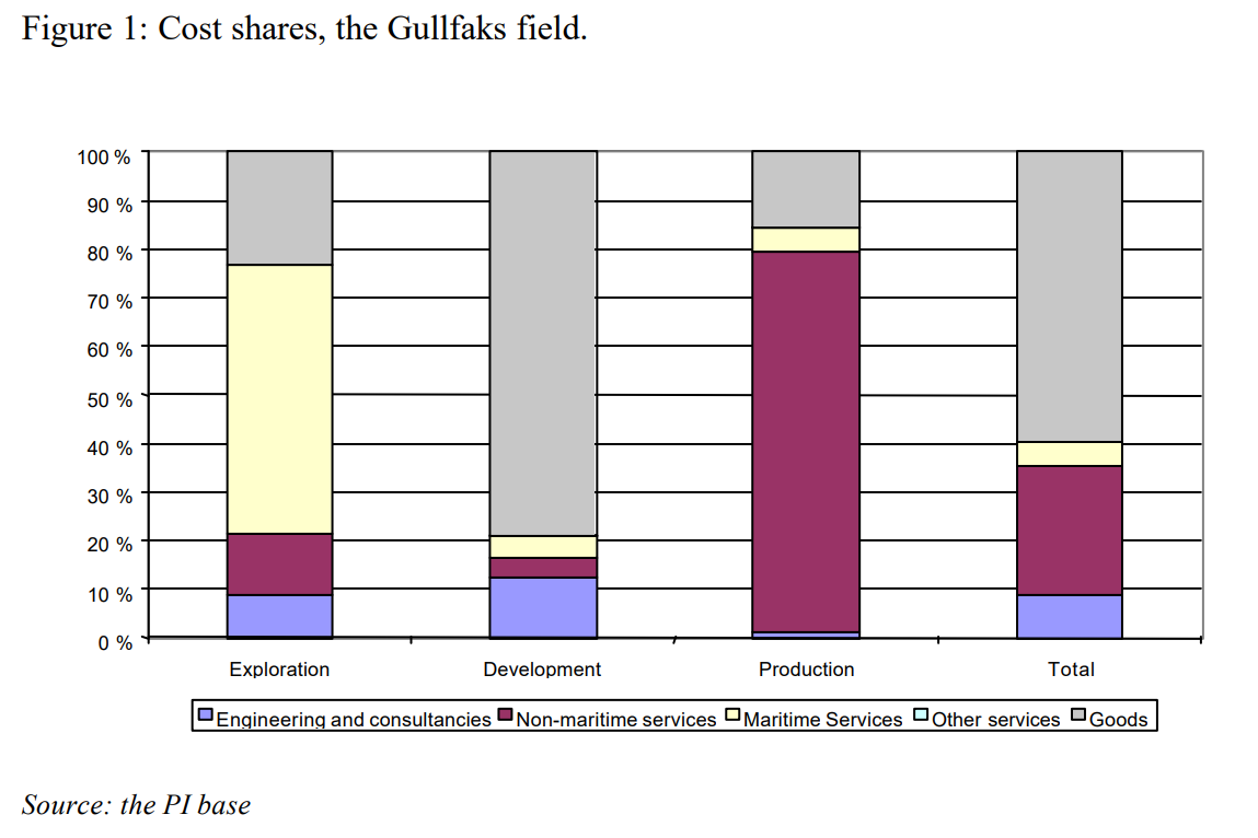 The breakdown of contracts shows that maritime services dominated spending during the exploration phase; goods were the largest expense during development; and non-maritime services were most significant during the operational phase.
