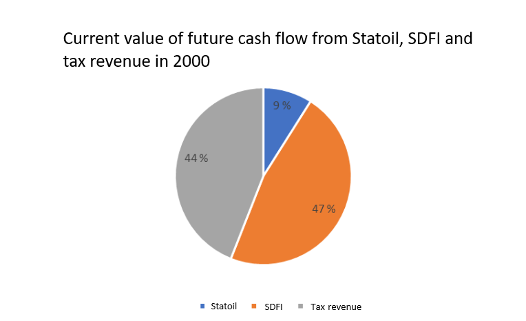 It’s hard to say how accurate that claim really was. In December 2000, the ministry estimated the net present value of future SDFI cash flows at around NOK 230 billion.[REMOVE]Fotnote: Olje- og energidepartementet. (2000). St.prp. nr. 36 (2000–2001): Eierskap i Statoil og fremtidig forvaltning av SDØE. Tilråding fra Olje- og energidepartementet av 15. desember 2000, godkjent i statsråd samme dag. Regjeringen. S. 16 https://www.regjeringen.no/no/dokumenter/stprp-nr-36-2000-2001-/id204183/?ch=1 The gross value of the portfolio was significantly higher (NOK 660 billion), but roughly 65 percent of that would have returned to the state via taxes and fees if sold. The NOK 230 billion figure therefore reflects what private buyers could expect to gain — after taxes. Statoil paid NOK 38.6 billion for 15 percent of the portfolio, which matches up fairly well with the estimated value per percentage point.