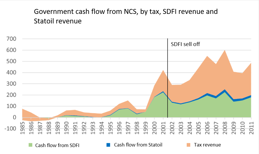 There is greater uncertainty around whether Statoil paid below market price. The post-sale decline in state revenues suggests they may have — the drop in cash flow in 2002 alone was double the amount Statoil paid.[REMOVE]Fotnote: The Norwegian Petroleum Directorate reports cash flow figures in 2023 prices. To enable comparison, the NOK 38.6 billion that Statoil paid for 15 percent of the SDFI has been adjusted using Statistics Norway’s inflation calculator, resulting in NOK 64.8 billion. Oil prices and Norwegian production levels were relatively stable at the time. But again, because there was no open auction, the true market value of the shares remains unknown.