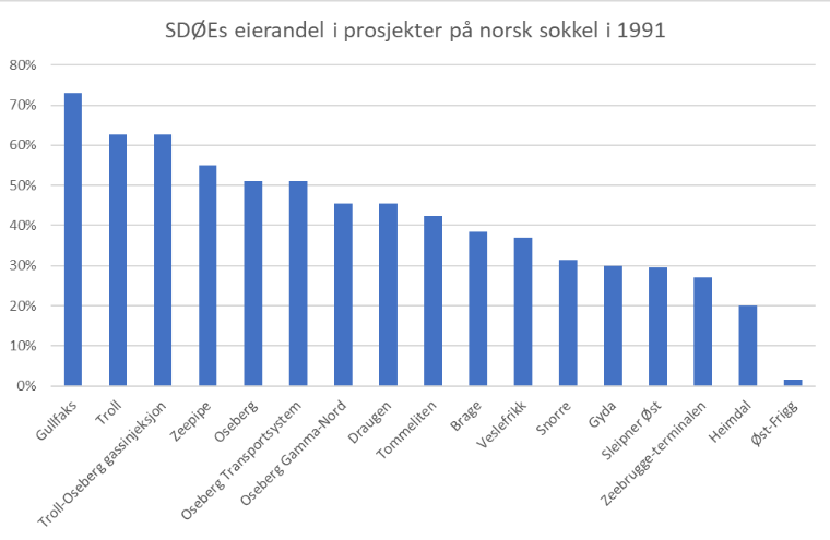 Som det fremgår av tabellen nedenfor, var SDØE-andelen svært varierende fra prosjekt til prosjekt, i årene etter opprettelsen. Gullfaks tronet i 1990 på toppen, med en SDØE-andel på 73 prosent. Øst-Frigg var på bunn, med en andel på 1,46 prosent. I tillegg var det flere lisenser SDØE ikke hadde eierandeler i, som Statfjord.