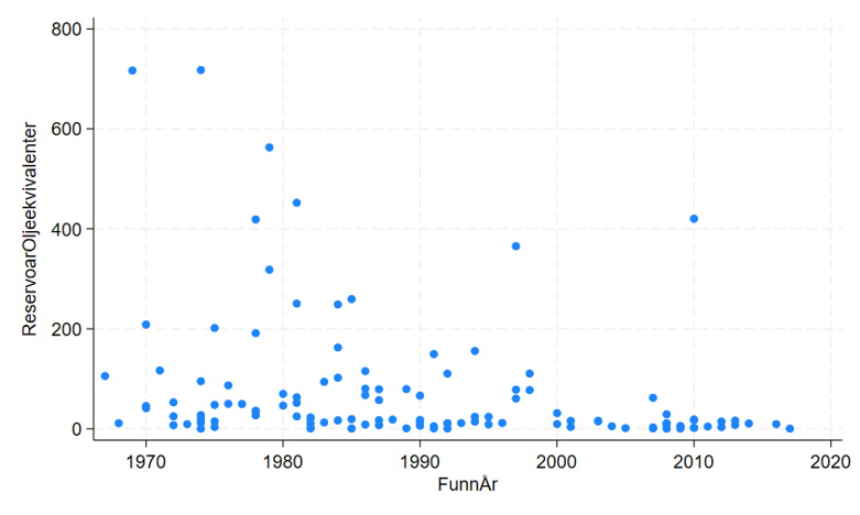 Utviklingen på Tampen reflekterer også en generell trend, nemlig at nyere felt ofte har mindre reservoarer enn eldre felt, ettersom norsk sokkel (og Nordsjøen i særdeleshet) blir stadig mer utforsket og moden. Men unntak finnes – som Johan Sverdrup (se den enslige blå prikken i 2010 i figuren under).