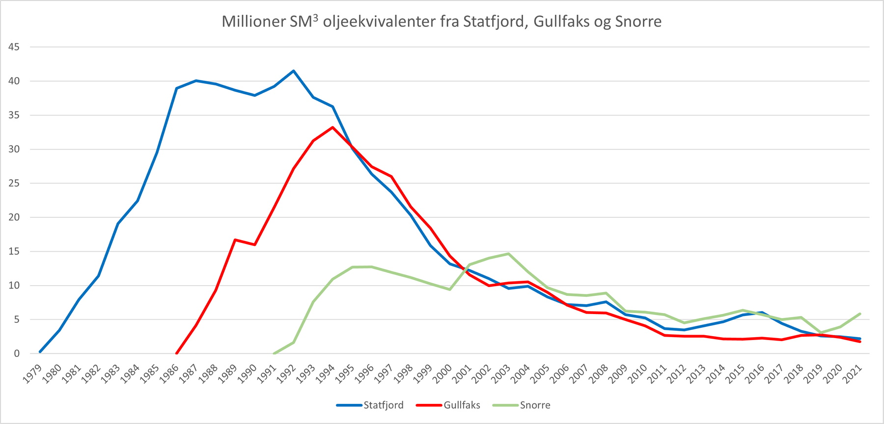 Tabell 1: Tall i millioner standard kubikkmeter oljeekvivalenter (Sm³ o.e.).[REMOVE]Fotnote: Tallene er hentet fra Norskpetroleum.no for Statfjord, Gullfaks og Snorre.