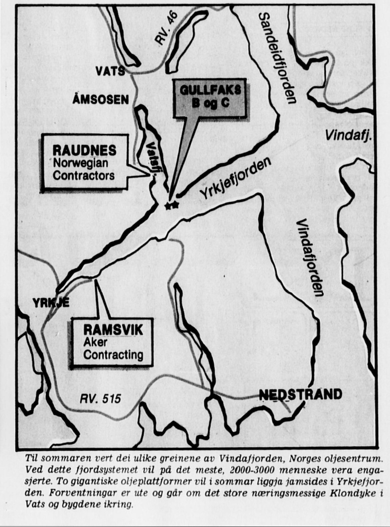 Like fullt hadde aktivitetene stor innvirkning på lokalmiljøet mens de stod på. Og aldri – verken før eller senere – ville aktiviteten bli så høy som etter ankomsten av Gullfaks B våren 1987 og spesielt under byggingen av Gullfaks Cs understell samme sommer.[REMOVE]Fotnote: Støpearbeidene på Trolls understell ca. seks år senere hadde 900 personer sysselsatt på skaftegliden, fordelt på fem skift. (Hovedgliden foregikk i Hinnavågen.) Se Førde, Thomas 1994. Varig verdensrekord sett i Yrkjefjorden. I: Stavanger Aftenblad 30.04.1994, s. 8. Anleggstrøkket disse hektiske månedene skulle gi området betegnelsen «Norges oljesentrum».[REMOVE]Fotnote: Førde, Thomas m fl. 1987. Historisk sommer: Klondyke i Vats. I Stavanger Aftenblad 27.03.1987, s. 13.