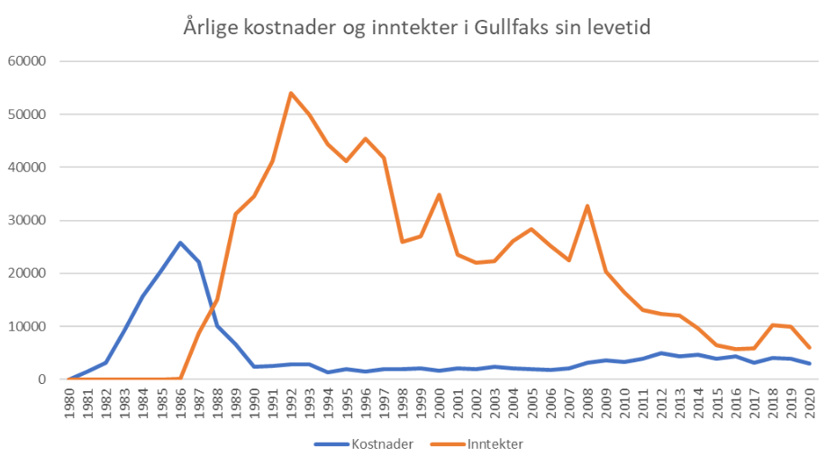 På tross av store investeringer har Gullfaks alt i alt vært svært lønnsomt. En grovutregning gir feltet inflasjonsjusterte inntekter på rundt det firdobbelte av investeringene som er gjort i feltet: 835 milliarder 2021-kroner.[REMOVE]Fotnote: Utregningen er gjort ved å gange årlig produksjon (både olje og gass), målt i form av oljeekvivalenter, med gjennomsnittlig oljepris og dollarkurs for det aktuelle året. Kronebeløpet (for både investeringer og anslag på inntekter) er deretter inflasjonsjustert etter norsk konsumprisindeks. Anslaget bygger altså ikke på den faktiske salgsprisen (den tar for eksempel ikke høyde for unike kvaliteter med Gullfaks-olje, relativt til Brent-olje), og er et grovt anslag. Tall for produksjon og nominelle investeringer er hentet fra Sokkeldirektoratets nettsider. Lenke til tallmateriale: Nøkkeltall lønnsomhet oljefelt.xlsx Det tilsvarer litt mer enn halvparten av statsbudsjettet for 2021.