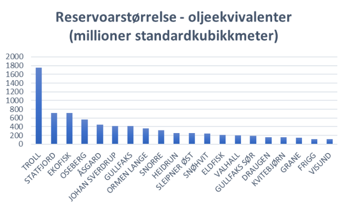 Gullfaks er i norsk sammenheng et stort oljefelt.[REMOVE]Fotnote: Sokkeldirektoratet anslår 2024 at de opprinnelig mengde utvinnbare ressurser er 418.9 millioner standardkubikkmeter oljeekvivalenter, hvorav det aller meste (390,8) er olje. Gullfaks-reservoaret er det femte største i Norge dersom man kun ser på oljereserver, men kommer på syvende plass om man inkluderer gass og NGL. Diagrammet nedenfor viser de 20 største feltene i Norge, med Gullfaks på syvende plass.