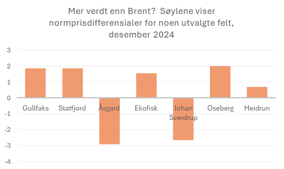 Når Gullfaks i desember 2024 hadde et differensial på 1,85 betyr det at den skattbare inntekten til Gullfaks-lisensen regnes ut med å ta utgangspunkt i normprisen for datert brent, fem dager etter lastedato (når oljen antas å nå kjøper), og deretter legges til 1,85 dollar per fat.[REMOVE]Fotnote: Energidepartementet. (2024, 9. desember). Petroleumsprisrådet og normpriser. Regjeringen. https://www.regjeringen.no/no/tema/energi/olje-og-gass/petroleumsprisradet–og-fastsetting-av-n/id661459/