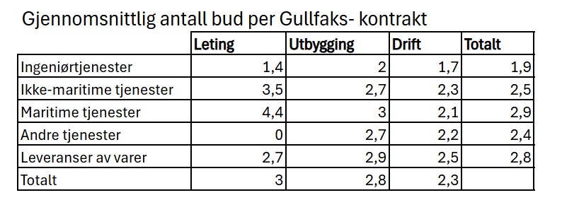 At leverandørmarkedet var konsentrert rundt få aktører, kom til uttrykk i det gjennomsnittlige antallet budgivere på Gullfaks-kontraktene. Det var relativt lavt, ofte med to eller tre tilbydere i snitt. Oversikten nedenfor viser gjennomsnittlig antall budgivere for bestemte typer kontrakter, knyttet til utbyggingen av Gullfaks-feltet.