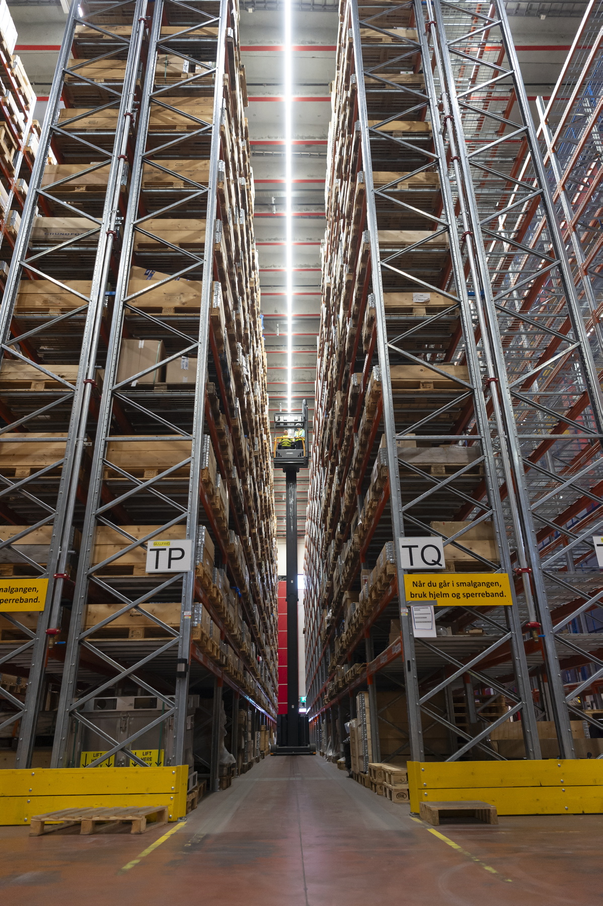 Dei mange pallane er lagra i 12 meter høge reolar. Her er det mellom 4500 og 5000 palleplassar. Då reolsystemet stod ferdig var det landets høgaste plukklager. I dag er det nok andre som er høgare, meiner operatør i CCB Mongstad, Roger Fredriksen, og operasjonskoordinator og sikringsleiar i Equinor, Arve Jostein Soltveit. Kanskje hjå Asko eller Toro? funderer dei.