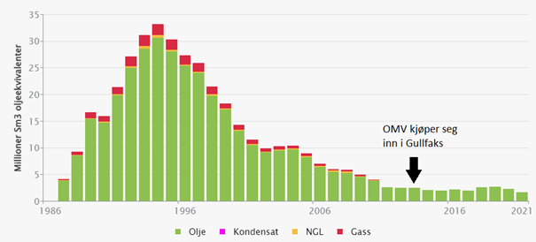 Gullfaks-produksjonen var i 2013 på snaue 16 millioner fat, noe som utgjorde 7,7 prosent av hva feltet hadde produsert i toppåret 1994. Gullfaks befant seg med det i haleproduksjonen. I den grad OMV satt på relevant kompetanse knyttet til senfase-produksjon og økt utvinning, kunne dette komme til nytte i Gullfaks-lisensen.[REMOVE]Fotnote: Øvrebek. H, Går fra oljeboring i potetåkre til Arktis. Stavanger Aftenblad 29.10.13 s. 16