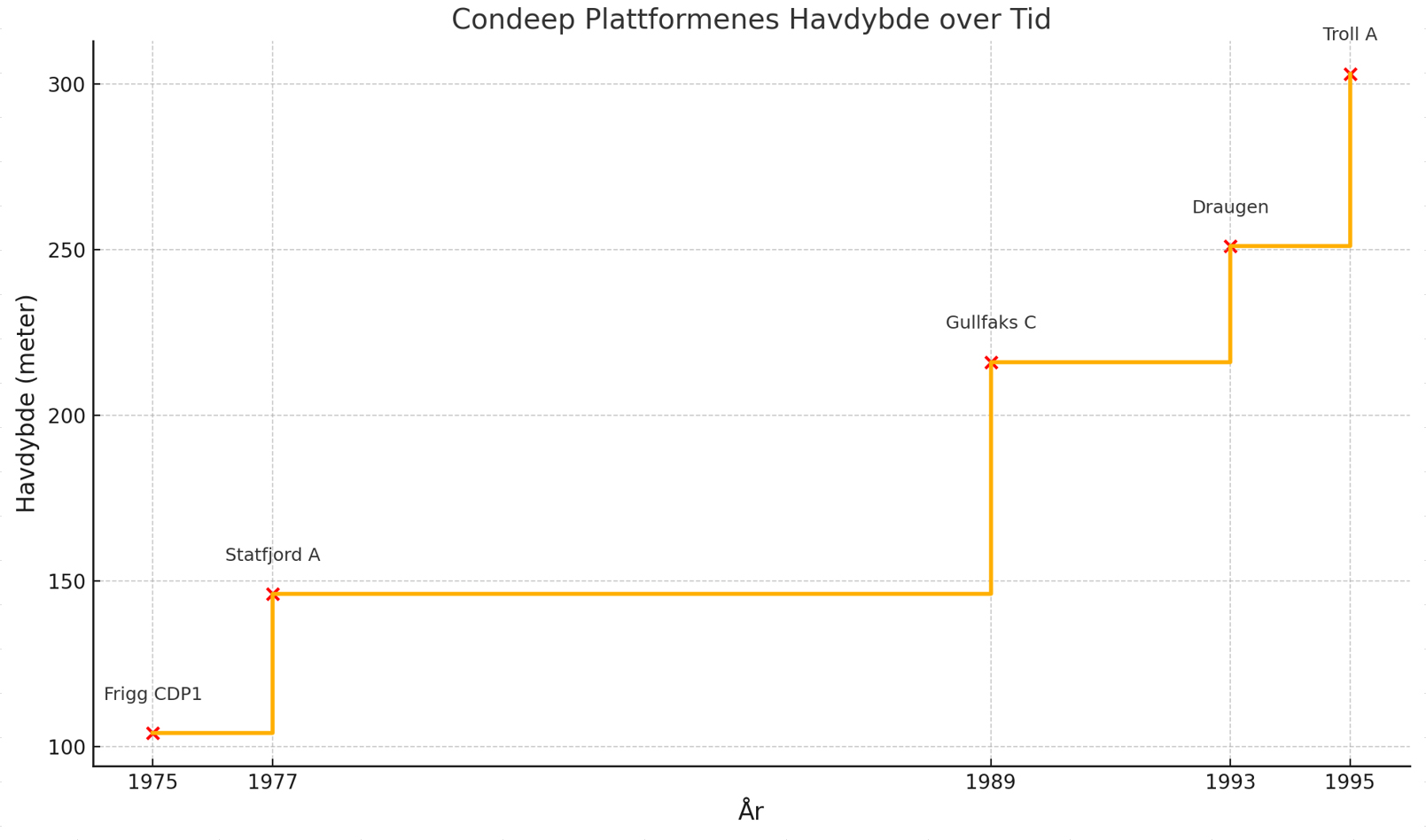 Figuren nedenfor viser hvilken condeep på norsk sokkel som til enhver tid har vært plassert på størst havdyp. Avstanden mellom Statfjord A og Gullfaks C representerer det største enkelthoppet, men rekorden holdt kun i fire år og ble slått av Draugen i 1993. Troll A er i dag den condeep-en som er plassert på det største dypet. Merk at condeep-er som er festet til havbunnen med strekkstag, som Snorre A og Heidun, ikke er inkludert.