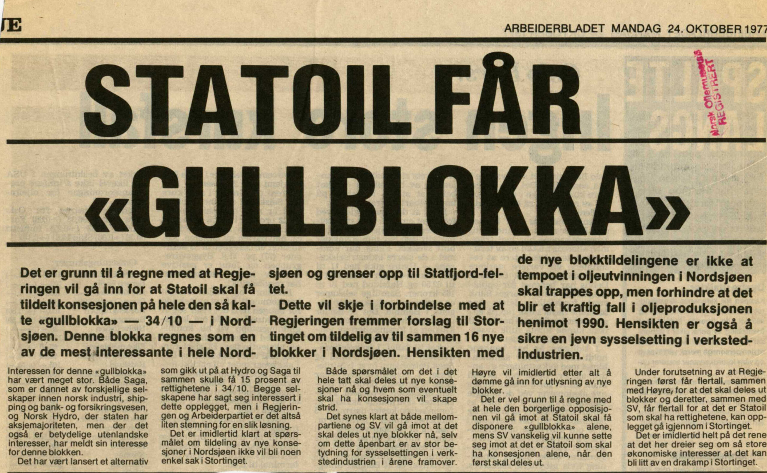 I Industridepartementets proposisjon nummer 72 (1977-78) står det at «[…] deltakelse i en relativt prospektiv blokk vil være hensiktsmessig for at Hydro og Saga skal kunne bidra til at de mange oppgaver som vi står foran innenfor oljevirksomheten blir løst på den måte Stortinget har forutsatt.»[REMOVE]Fotnote:Industridepartementet st. Prp. Nr. 72 (1977—78) Om utlysning og tildeling av blokker på kontinentalsokkelen, og om boringer etter petroleum i statlig regi. Hentet fra: https://www.stortinget.no/no/Saker-og-publikasjoner/Stortingsforhandlinger/Lesevisning/?p=1977-78&paid=2&wid=a&psid=DIVL895